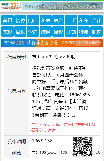宁晋123(www.nj123.cc)提醒您:手工活、网络兼职、刷单,都是骗子!凡以各种名义收取费用的都是骗子!找工作是往兜里挣钱,让你往外掏钱的都是骗子!异地招聘请提高警惕,谨防诈骗!