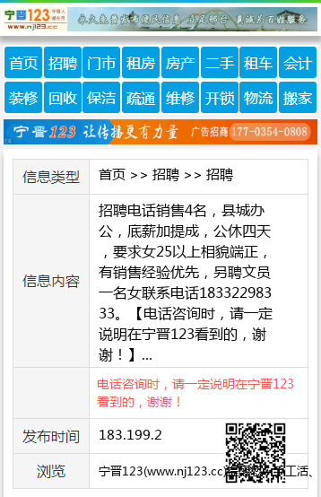 招聘电话销售4名,县城办公,底薪加提成,公休四天,要求女25以上相貌端正,有销售经验优先,另聘文员一名女联系电话18332298333。