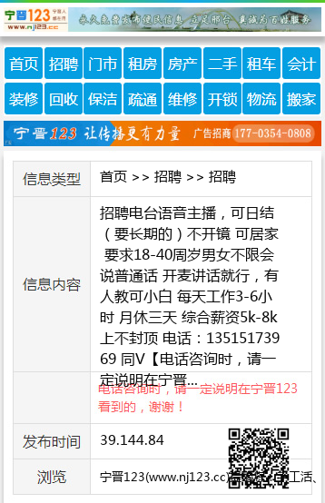 | 防骗提醒: | 宁晋123(www.nj123.cc)提醒您:手工活、网络兼职、刷单,都是骗子!凡以各种名义收取费用的都是骗子!找工作是往兜里挣钱,让你往外掏钱的都是骗子!异地招聘请提高警惕,谨防诈骗! |