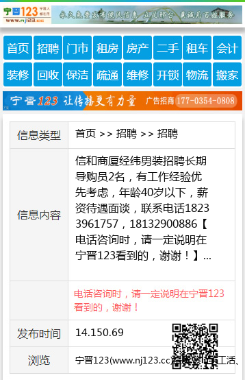 信和商厦经纬男装招聘长期导购员2名,有工作经验优先考虑,年龄40岁以下,薪资待遇面谈,联系电话18233961757,18132900886 【电话咨询时,请一定说明在宁晋123看到的,谢谢!】 |