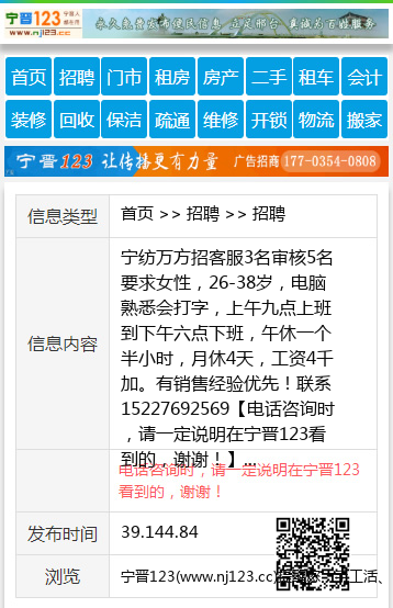 宁纺万方招客服3名审核5名要求女性,26-38岁,电脑熟悉会打字,上午九点上班到下午六点下班,午休一个半小时,月休4天,工资4千加。有销售经验优先!联系15227692569 【电话咨询时,请一定说明在宁晋123看到的,谢谢!】 |