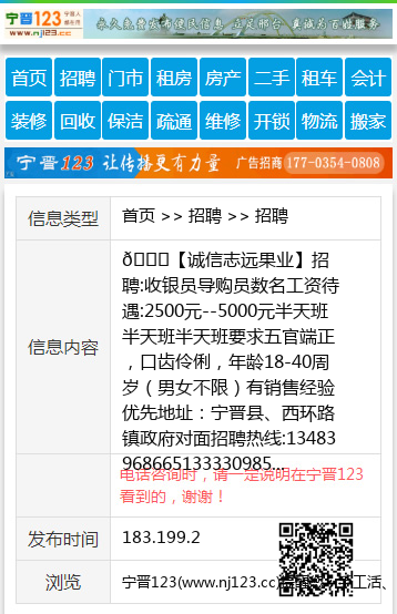 | 防骗提醒: | 宁晋123(www.nj123.cc)提醒您:手工活、网络兼职、刷单,都是骗子!凡以各种名义收取费用的都是骗子!找工作是往兜里挣钱,让你往外掏钱的都是骗子!异地招聘请提高警惕,谨防诈骗! |
