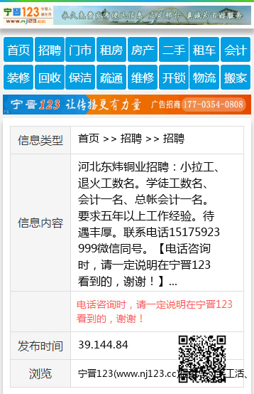 河北东炜铜业招聘:小拉工、退火工数名。学徒工数名、会计一名、总帐会计一名。要求五年以上工作经验。待遇丰厚。联系电话15175923999微信同号。 【电话咨询时,请一定说明在宁晋123看到的,谢谢!】 |
