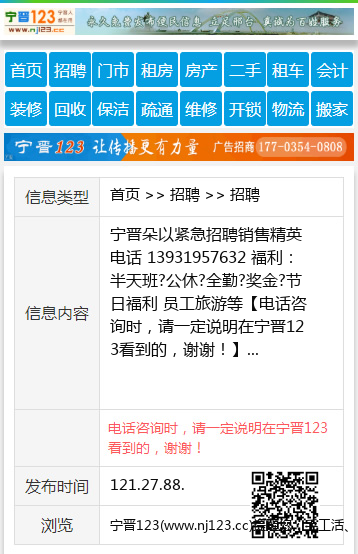 宁晋朵以紧急招聘销售精英电话 13931957632 福利:半天班?公休?全勤?奖金?节日福利 员工旅游等 【电话咨询时,请一定说明在宁晋123看到的,谢谢!】 |