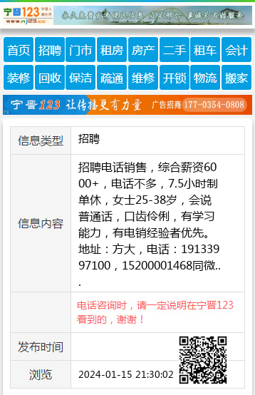 招聘电话销售,综合薪资6000+,电话不多,7.5小时制单休,女士25-38岁,会说普通话,口齿伶俐,有学习能力,有电销经验者优先。地址:方大,电话:19133997100,15200001468同微 【电话咨询时,请一定说明在宁晋123看到的,谢谢!】 |
