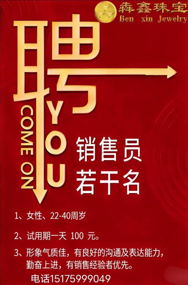 犇鑫珠宝招导购员, 销售店长,销售主管, 有责任心 上进心优先 临时工 男士勿扰 试用期一天100元, 带薪休假4---5天 电话:15175999049【电话咨询时,请一定说明在宁晋123看到的,谢谢!】 |