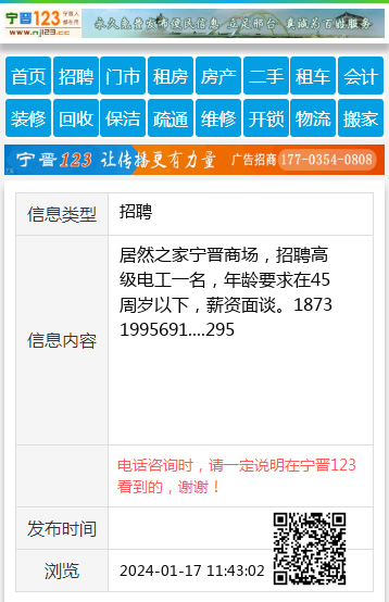 居然之家宁晋商场,招聘高级电工一名,年龄要求在45周岁以下,薪资面谈。18731995691....295