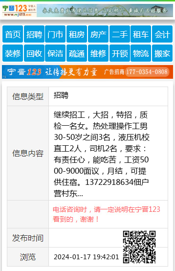 继续招工,大招,特招,质检一名女。热处理操作工男30-50岁之间3名,液压机校直工2人,司机2名,要求:有责任心,能吃苦,工资5000-9000面议,月结,可提供住宿。13722918634佃户营村东 【电话咨询时,请一定说明在宁晋123看到的,谢谢!】 |