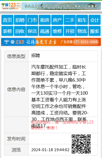 汽车摩托配件加工,临时长期都行,稳定踏实肯干,工作简单不累,早八晚6.30中午休息一个半小时,管吃,一天130实习一个月一天100基本工资看个人能力有上涨空间工作之余也可销售配件高提成,工资月结。要男20-30,工作地点西王里,联系电话17633093442 【电话咨询时,请一定说明在宁晋123看到的,谢谢!】 |