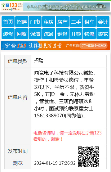 鼎瓷电子科技有限公司诚招:操作工和检验员岗位,年龄37以下、学历不限,薪资4-5K,五险一金,无体力劳动,管食宿、三班倒每班次8小时,面试预约联系童女士15613389070(同微信) 【电话咨询时,请一定说明在宁晋123看到的,谢谢!】 |