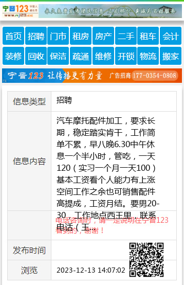 汽车摩托配件加工,要求长期,稳定踏实肯干,工作简单不累,早八晚6.30中午休息一个半小时,管吃,一天120(实习一个月一天100)基本工资看个人能力有上涨空间工作之余也可销售配件高提成,工资月结。要男20-30,工作地点西王里,联系电话(王)17633093442 【电话咨询时,请一定说明在宁晋123看到的,谢谢!】 |