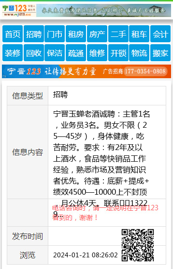 宁晋玉蝉老酒诚聘:主管1名,业务员3名。男女不限(25—45岁),身体健康,吃苦耐劳。要求:有2年及以上酒水,食品等快销品工作经验,熟悉市场及营销知识者优先。待遇:底薪+提成+绩效4500—10000上不封顶,月公休4天。联系☎️13229891187 【电话咨询时,请一定说明在宁晋123看到的,谢谢!】 |