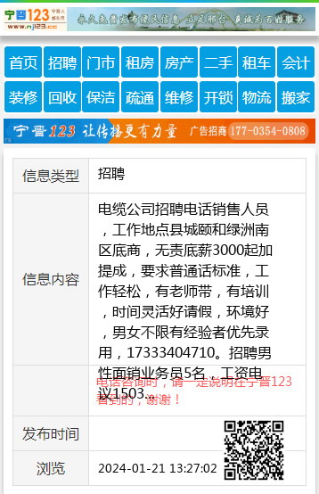 电缆公司招聘电话销售人员,工作地点县城颐和绿洲南区底商,无责底薪3000起加提成,要求普通话标准,工作轻松,有老师带,有培训,时间灵活好请假,环境好,男女不限有经验者优先录用,17333404710。招聘男性面销业务员5名,工资电议15031941667。 济南库房招司机2名,普工2名,工资电议15031941667