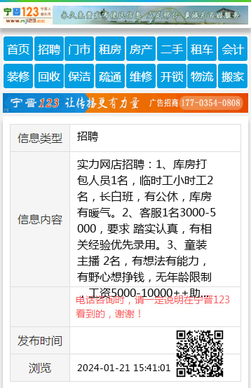 实力网店招聘:1、库房打包人员1名,临时工小时工2名,长白班,有公休,库房有暖气。2、客服1名3000-5000,要求 踏实认真,有相关经验优先录用。3、童装主播 2名,有想法有能力,有野心想挣钱,无年龄限制,工资5000-10000++助播2名,积极阳光,有工作经验者优先录用!!地址:东亚 菜市场 大医院附近 县城 ,联系电话15533197597 【电话咨询时,请一定说明在宁晋123看到的,谢谢!】 |