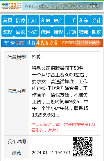 移动公司招聘暑假工50名,一个月综合工资3000左右,要求女,普通话标准,工作内容接打电话升降套餐,工作简单,请假方便,不拖欠工资,上班时间早9晚6,中午一个半小时午休,联系15132989361 【电话咨询时,请一定说明在宁晋123看到的,谢谢!】 |