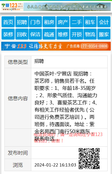 中国茶叶-宁晋店 现招聘:茶艺师,销售员若干名。任职要求:1、年龄18-35周岁;2、形象气质佳、沟通能力良好;3、喜爱茶艺工作;4、有相关工作经验者优先(公司进行免费茶艺培训)。两班倒,待遇面谈。地址:紫金名苑西门南行50米路东,联系电话:18732956686,13730484623 【电话咨询时,请一定说明在宁晋123看到的,谢谢!】 |
