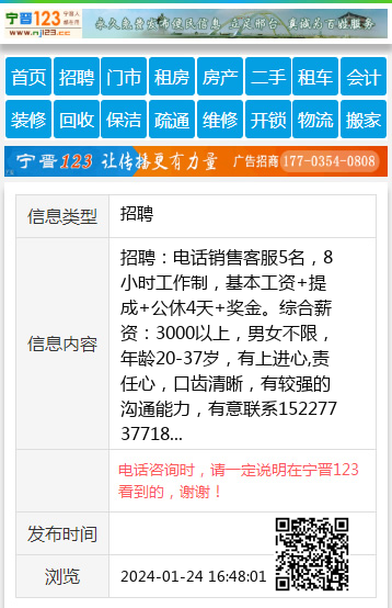 招聘:电话销售客服5名,8小时工作制,基本工资+提成+公休4天+奖金。综合薪资:3000以上,男女不限,年龄20-37岁,有上进心,责任心,口齿清晰,有较强的沟通能力,有意联系15227737718 【电话咨询时,请一定说明在宁晋123看到的,谢谢!】 |