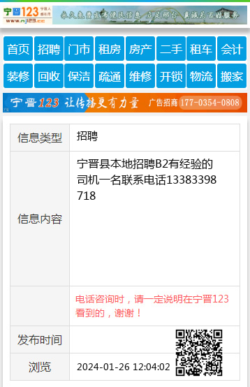 宁晋县本地招聘B2有经验的司机一名联系电话13383398718