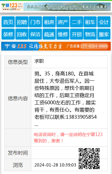 男。35,身高180。在县城居住,大专退伍军人。因一些特殊原因,想找个前期日结的工作,后期工资稳定月工资6000左右的工作,踏实肯干,有责任心。有需要的老板可以联系:13833905854 【电话咨询时,请一定说明在宁晋123看到的,谢谢!】 |