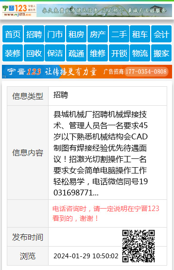 县城机械厂招聘机械焊接技术、管理人员各一名要求45岁以下熟悉机械结构会CAD制图有焊接经验优先待遇面议!招激光切割操作工一名要求女会简单电脑操作工作轻松易学,电话微信同号19031698771