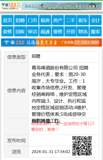 青岛啤酒股份有限公司 招聘业务代表,要求:男20-30周岁,大专毕业。工作:1收集市场信息;2开发、管理经销商网络,维护定格区域内终端;3、设计、执行和监控定格区域促销活动;4维护、管理价格体系;5完成领导交办的其他工作;