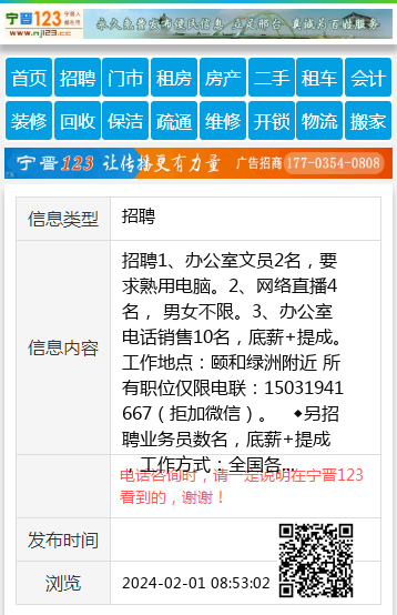 招聘1、办公室文员2名,要求熟用电脑。2、网络直播4名, 男女不限。3、办公室电话销售10名,底薪+提成。工作地点:颐和绿洲附近 所有职位仅限电联:15031941667(拒加微信)。 ◆另招聘业务员数名,底薪+提成 ,工作方式:全国各地面销推广 仅限电联:13937194656 13675411866 有相关工作经验优先录用!!! 【电话咨询时,请一定说明在宁晋123看到的,谢谢!】 |