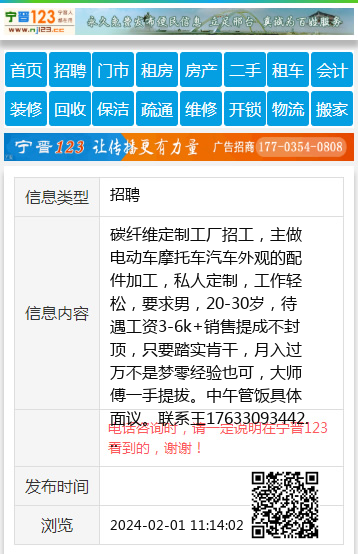 碳纤维定制工厂招工,主做电动车摩托车汽车外观的配件加工,私人定制,工作轻松,要求男,20-30岁,待遇工资3-6k+销售提成不封顶,只要踏实肯干,月入过万不是梦零经验也可,大师傅一手提拔。中午管饭具体面议。联系王17633093442 【电话咨询时,请一定说明在宁晋123看到的,谢谢!】 |