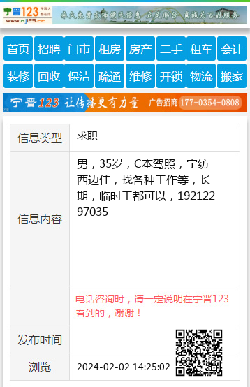 男,35岁,C本驾照,宁纺西边住,找各种工作等,长期,临时工都可以,19212297035