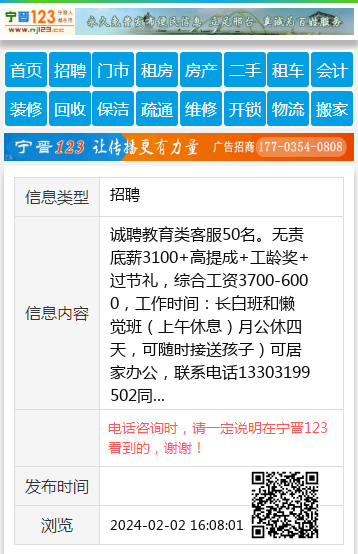 诚聘教育类客服50名。无责底薪3100+高提成+工龄奖+过节礼,综合工资3700-6000,工作时间:长白班和懒觉班(上午休息)月公休四天,可随时接送孩子)可居家办公,联系电话13303199502同 【电话咨询时,请一定说明在宁晋123看到的,谢谢!】 |