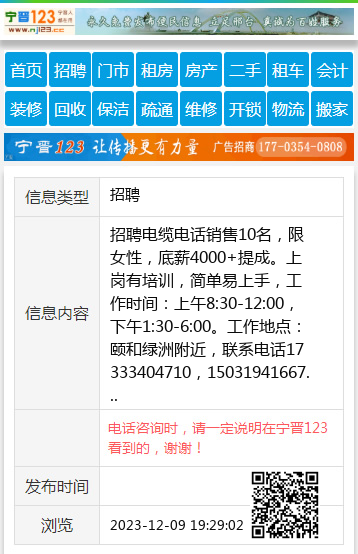 招聘电缆电话销售10名,限女性,底薪4000+提成。上岗有培训,简单易上手,工作时间:上午8:30-12:00,下午1:30-6:00。工作地点:颐和绿洲附近,联系电话17333404710,15031941667