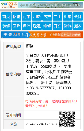 宁晋县方大科技园招聘:电工2名,要求:男,高中及以上学历,55周岁以下,要求有电工证,公休多,工作轻松,县城附近,有工作经验者优先,工资面议,联系电话:0319-5777767、15100932009 【电话咨询时,请一定说明在宁晋123看到的,谢谢!】 |