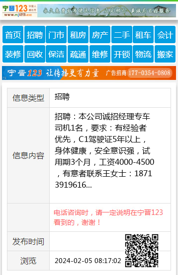 招聘:本公司诚招经理专车司机1名,要求:有经验者优先,C1驾驶证5年以上,身体健康,安全意识强,试用期3个月,工资4000-4500,有意者联系王女士:18713919616 【电话咨询时,请一定说明在宁晋123看到的,谢谢!】 |