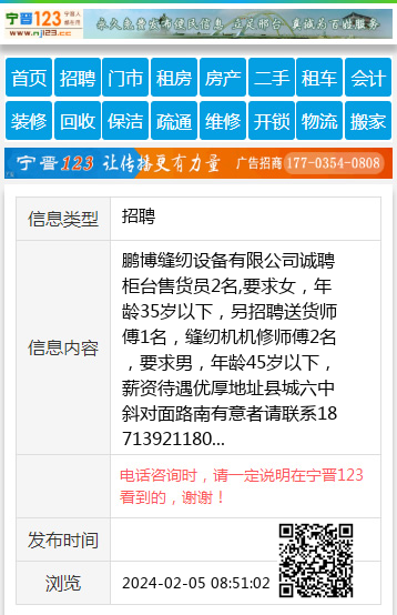 鹏博缝纫设备有限公司诚聘柜台售货员2名,要求女,年龄35岁以下,另招聘送货师傅1名,缝纫机机修师傅2名,要求男,年龄45岁以下,薪资待遇优厚地址县城六中斜对面路南有意者请联系18713921180 【电话咨询时,请一定说明在宁晋123看到的,谢谢!】 |