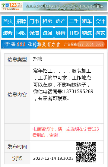常年招工,,,,服装加工,上手简单可学,工作地点可以在家,不影响接孩子,微信电话同号:13731595269,有意者可联系 【电话咨询时,请一定说明在宁晋123看到的,谢谢!】 |