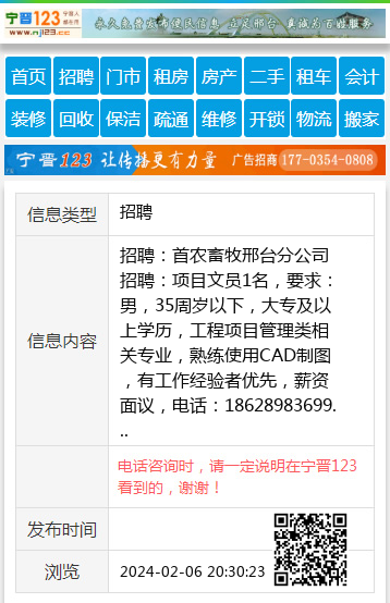 招聘:首农畜牧邢台分公司招聘:项目文员1名,要求:男,35周岁以下,大专及以上学历,工程项目管理类相关专业,熟练使用CAD制图,有工作经验者优先,薪资面议,电话:18628983699 【电话咨询时,请一定说明在宁晋123看到的,谢谢!】 |