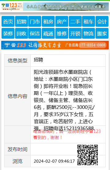 阳光连锁超市水墨庭院店(地址:水墨庭院小区门口东侧)即将开业啦!现急招长期(一年以上)理货员、收银员、储备主管、储备店长6名,薪酬2500元--3000元/月,要求35岁以下女性,五官端正,吃苦耐劳,上进心强。招聘电话15231936588 【电话咨询时,请一定说明在宁晋123看到的,谢谢!】 |