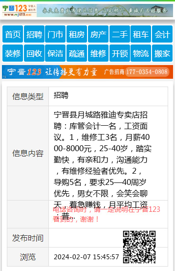 宁晋县月城路雅迪专卖店招聘:库管会计一名,工资面议。1,维修工3名,月薪4000-8000元,25-40岁,踏实勤快,有亲和力,沟通能力,有维修经验者优先。2,导购5名,要求25—40周岁优先,男女不限,会笑会聊天,着急赚钱,月平均工资:普通导购4000起步,优秀导购5000起步。,有意面谈我们期待您的加入,一起实现我们共同人生的梦想,你有才艺我有舞台,快快加入我们吧!!!地址:月城路雅迪专卖店(移动公司南行)电话:13933719696 13731591590(微信同号) 【电话咨询时,请一定说明在宁晋123看到的,谢谢!】 |
