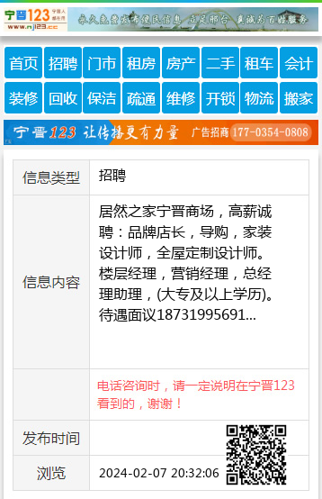 居然之家宁晋商场,高薪诚聘:品牌店长,导购,家装设计师,全屋定制设计师。楼层经理,营销经理,总经理助理,(大专及以上学历)。待遇面议18731995691 【电话咨询时,请一定说明在宁晋123看到的,谢谢!】 |