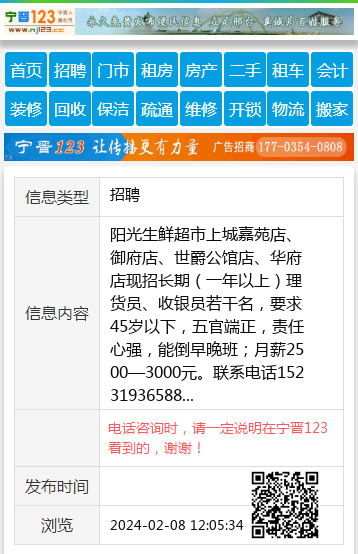 阳光生鲜超市上城嘉苑店、御府店、世爵公馆店、华府店现招长期(一年以上)理货员、收银员若干名,要求45岁以下,五官端正,责任心强,能倒早晚班;月薪2500—3000元。联系电话15231936588 【电话咨询时,请一定说明在宁晋123看到的,谢谢!】 |