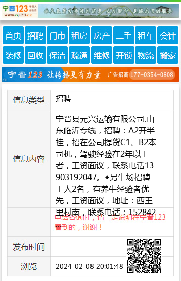 宁晋县元兴运输有限公司.山东临沂专线,招聘:A2开半挂,招在公司提货C1、B2本司机,驾驶经验在2年以上者,工资面议,联系电话13903192047。◆另牛场招聘工人2名,有养牛经验者优先,工资面议,地址:西王里村南,联系电话:15284299988 【电话咨询时,请一定说明在宁晋123看到的,谢谢!】 |