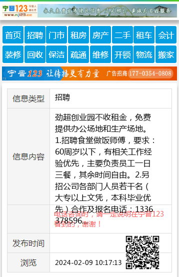 劲超创业园不收租金,免费提供办公场地和生产场地。1.招聘食堂做饭师傅,要求:60周岁以下,有相关工作经验优先,主要负责员工一日三餐,其余时间自由。2.另招公司各部门人员若干名(大专以上文凭,本科毕业优先)合作及报名电话:13363785961 【电话咨询时,请一定说明在宁晋123看到的,谢谢!】 |