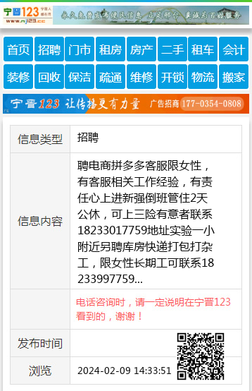 聘电商拼多多客服限女性,有客服相关工作经验,有责任心上进新强倒班管住2天公休,可上三险有意者联系18233017759地址实验一小附近另聘库房快递打包打杂工,限女性长期工可联系18233997759 【电话咨询时,请一定说明在宁晋123看到的,谢谢!】 |