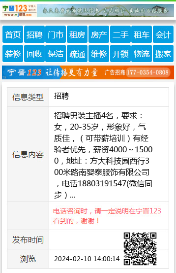 招聘男装主播4名,要求:女,20-35岁,形象好,气质佳,(可带薪培训)有经验者优先,薪资4000~15000,地址:方大科技园西行300米路南婴泰服饰有限公司,电话18803191547(微信同步) 【电话咨询时,请一定说明在宁晋123看到的,谢谢!】 |