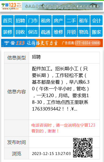 配件加工。招长期小工(只要长期),工作轻松不累(基本都是坐着),早八晚6.30(午休一个半小时,管吃),一天120,月结。要求男18-30,工作地点西王里联系17633093442!!.¥ 【电话咨询时,请一定说明在宁晋123看到的,谢谢!】 |