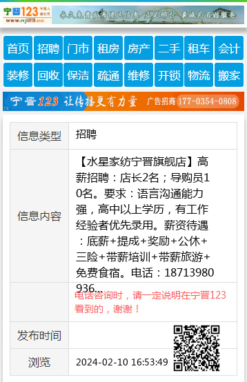 【水星家纺宁晋旗舰店】高薪招聘:店长2名;导购员10名。要求:语言沟通能力强,高中以上学历,有工作经验者优先录用。薪资待遇:底薪+提成+奖励+公休+三险+带薪培训+带薪旅游+免费食宿。电话:18713980936 【电话咨询时,请一定说明在宁晋123看到的,谢谢!】 |