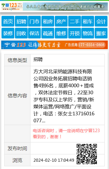 方大河北采纳能源科技有限公司因业务拓展招聘电话销售4到6名,底薪4000+提成,双休法定节假日,22至30岁专科及以上学历,营销/新媒体运营/网络推广/平面设计,电话:张女士13716016077 【电话咨询时,请一定说明在宁晋123看到的,谢谢!】 |