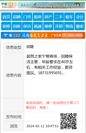 居然之家宁晋商场,招聘保洁主管,年龄要求在40岁左右,有相关工作经验,薪资面议。18731995691