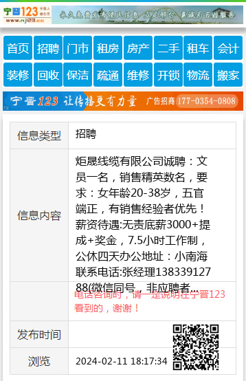炬晟线缆有限公司诚聘:文员一名,销售精英数名,要求:女年龄20-38岁,五官端正,有销售经验者优先!薪资待遇:无责底薪3000+提成+奖金,7.5小时工作制,公休四天办公地址:小南海联系电话:张经理13833912788(微信同号,非应聘者勿扰) 【电话咨询时,请一定说明在宁晋123看到的,谢谢!】 |