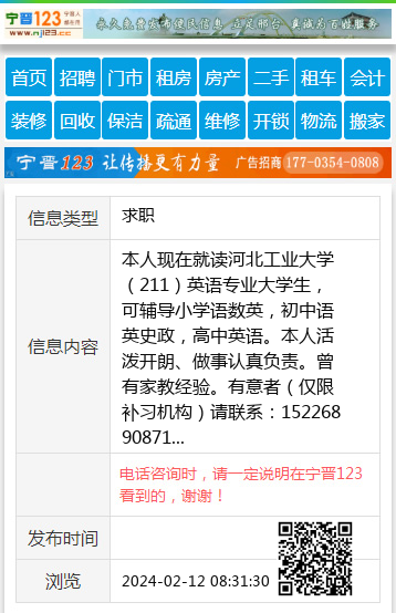 本人现在就读河北工业大学(211)英语专业大学生,可辅导小学语数英,初中语英史政,高中英语。本人活泼开朗、做事认真负责。曾有家教经验。有意者(仅限补习机构)请联系:15226890871 【电话咨询时,请一定说明在宁晋123看到的,谢谢!】 |