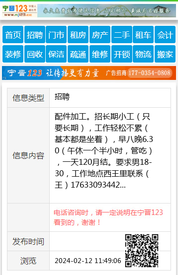 配件加工。招长期小工(只要长期),工作轻松不累(基本都是坐着),早八晚6.30(午休一个半小时,管吃),一天120月结。要求男18-30,工作地点西王里联系(王)17633093442 【电话咨询时,请一定说明在宁晋123看到的,谢谢!】 |